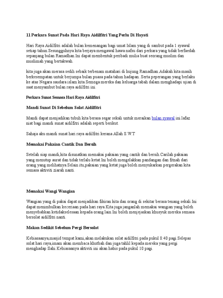 Aidilfitri adalah hari umat islam menyambut kemenangan kerana telah berjaya mengawal nafsu makan dan minum selama sebulan. Esok ramadhan kareem akan meninggalkan kita semua. Sahaja aku sembahyang sunat aidilfitri dua rakaat sebagai imam kerana allah taala. Namun, mandi yang diharuskan ialah mandi pada hari jumaat, hari arafah, hari aidiladha dan aidilfitri. hadis riwayat imam syafie di dalam musnad. Sembahyang sunat hari raya dikerjakan pada hari raya pertama iaitu pada 1 syawal bagi solat sunat aidilfitri dan 10 zulhijjah bagi solat sunat aidiladha.